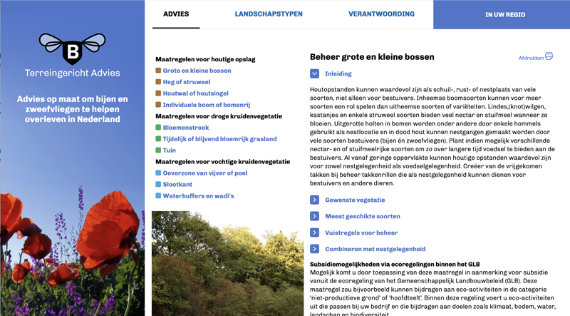 Terreineigenaren krijgen zo concreet mogelijk advies over hoe ze bestuivers kunnen helpen op een manier waarbij ze hun specifieke plek zo effectief mogelijk benutten. Een advies op maat dus, bestaande uit een keuzepalet van maatregelen en praktische vuistregels voor de aanleg en het onderhoud daarvan.